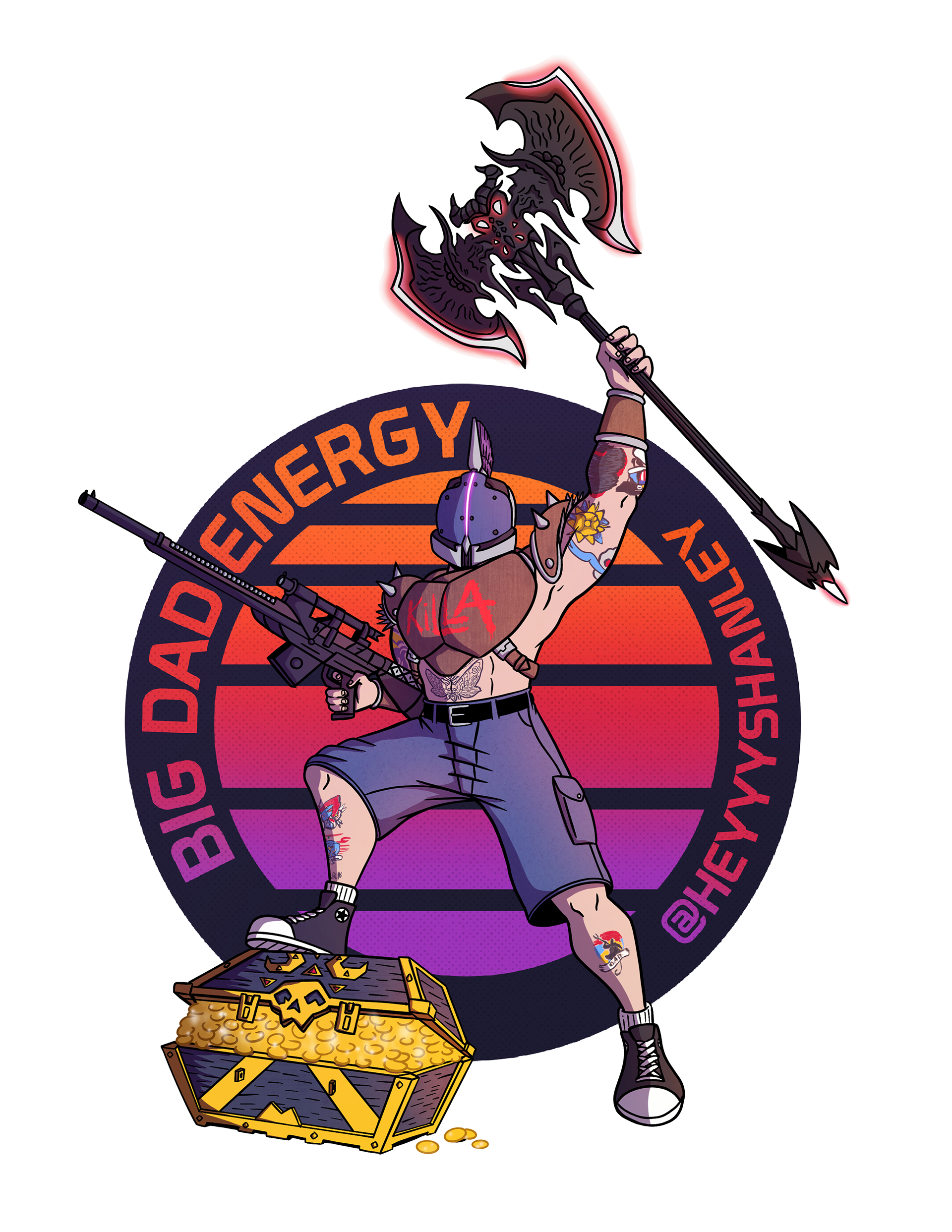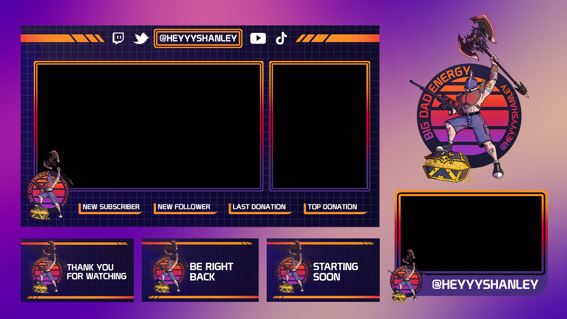 Twitch overlays and graphics designed for a streamer under the name HeyyShanley. This project included illustrating a logo along with making screen overlays for when he's streaming.