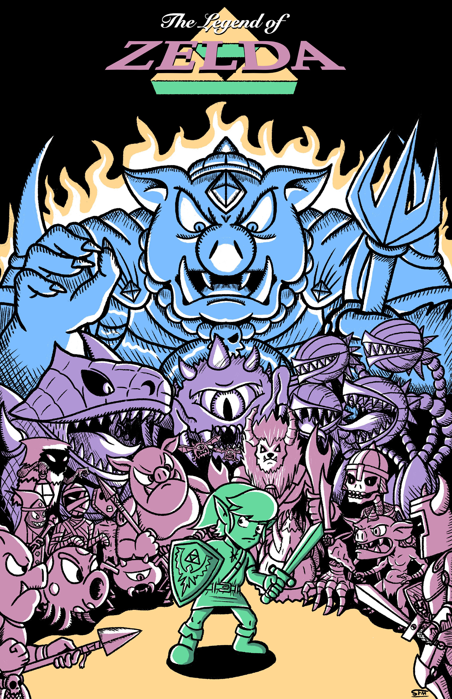An illustration based on the video game series The Legend of Zelda. I wanted to feature Link surrounded by most of the enemies from the earlier entries of the series, using differing colors to signify a hierarchy between the characters.